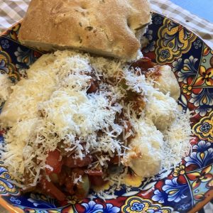 Today I made ricotta gnocchi in a tomato and pepper sauce with foccacia Because it was Sunday, I also made dessert which was a chocolate and orange cream whip (forgot to take photo…