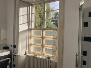 Today I filled in a load of holes down the back of the skirtings and in the door frame.  I primed all of this plus the shutters and all the rest of the window furniture, plus the boxed in area around the loo.  Unfortunately although the shutters are functional (in that they would open and close) they can’t be used because the 1930s cast iron radiator is in the way.  The only solution to this would be to replace the radiator with a modern slimline one, but I am not going to do that.  The shutters may be more authentically Victorian, but the 1930s heating system is part of the living history of the house itself.  Also the radiators look nice.  Also we may be in need of a super hot radiator in the bathroom come winter as it is a big room with big single glazed windows.  Also we need to restrain our spending.