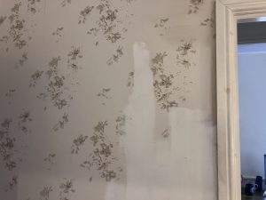 The latest room to be decorated is J’s basement bedroom and the two of us worked on it together. It had been pretty grotty – this was the wallpaper. The woodwork was also a mess and full of holes.