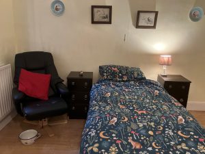 This is the bedroom that any elderly and infirm visitors would use were they to visit, so I would wish to assure them that were they to come the room is very nice and that the real bathroom is next door. They would need to watch out for the ghosties though.