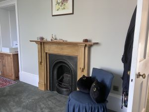 The fireplace is not original anything – it looks to have been custom made recently and was just raw wood.  I sanded it back and varnished it.  The fire grate is original – I have cleaned it but I still need to buy some proper black lead and polish it up.
