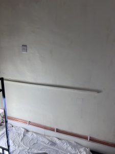 Then I made a start on decorating J’s office. I said to him “Getting this right is quite a big job – I need to fill in a load of holes, put a new piece of skirting in, paint some cupboards nicely (using masking tape to get straight lines), sand down a set of shelves and then varnish them etc. So if I do that, it will take me about a week until you can be back in there. Or if I just paint the walls I will be finished tomorrow”. Guess which option he went for. Hint, the picture is the wall I just painted.