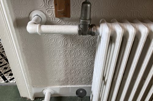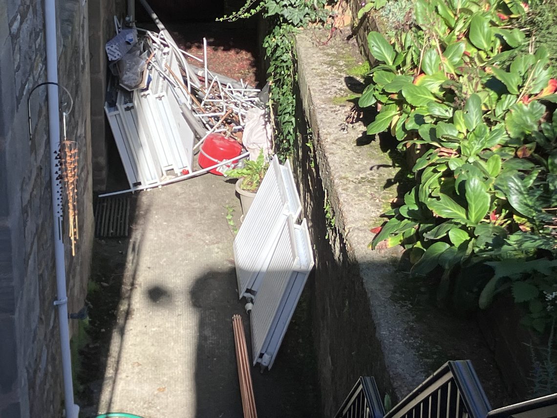 The central heating in the basement has been shot ever since we moved in. We originally had a firm of plumbers in to look at fixing it, but this proved to be impossible, because neither the boiler nor the pipes had been looked at in many years (possibly since 1977 which was when the flat was separated from the rest of the house) and they were so full of filth and rust that they could not be salvaged. So this week our plumbing team (both female which is unusual and great to see) have been completely replacing it. This is the pile of stuff being removed – the round red thing is the old boiler believe it or not!