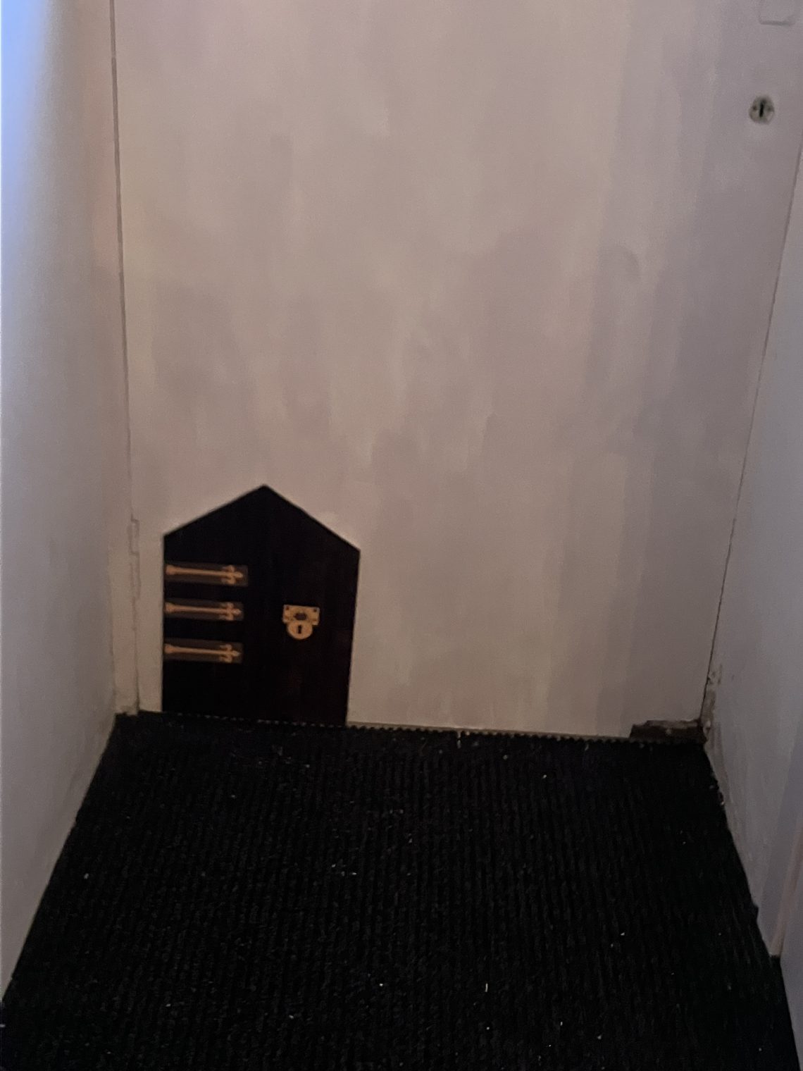 So I made a little “door” to cover the flap. This was a little bit more complicated than it appeared at first sight because the flap is not flush to the door (it sticks out by about 5mm), and the door itself is a cheap hollow thing. This means that there needs to be a frame between the real door and the fake one, but you can’t easily screw this on to to the door itself. So I made a thin frame and glued it on to the door, and then mounted magnets around it. I then made a “door” and attached magnets to it as well. I am very glad I decided to make this out of art board as a trial first, because I had no idea whether it would actually work, and it took a lot of trial and error to get everything positioned correctly. But I got it to work after a few goes. I painted it to look like an old dungeon door and stuck on some “hinges” and a “lock”.