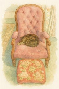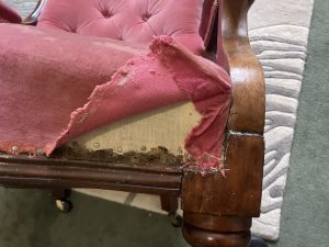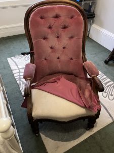 This chair is Edwardian, and would be nice except it has two major cracks in its frame, the springs in the seat have gone, and the seat fabric itself is faded, stained and has a big burn hole in it. It didn’t look too bad with a cat sitting on it, but in real life it was pretty awful.