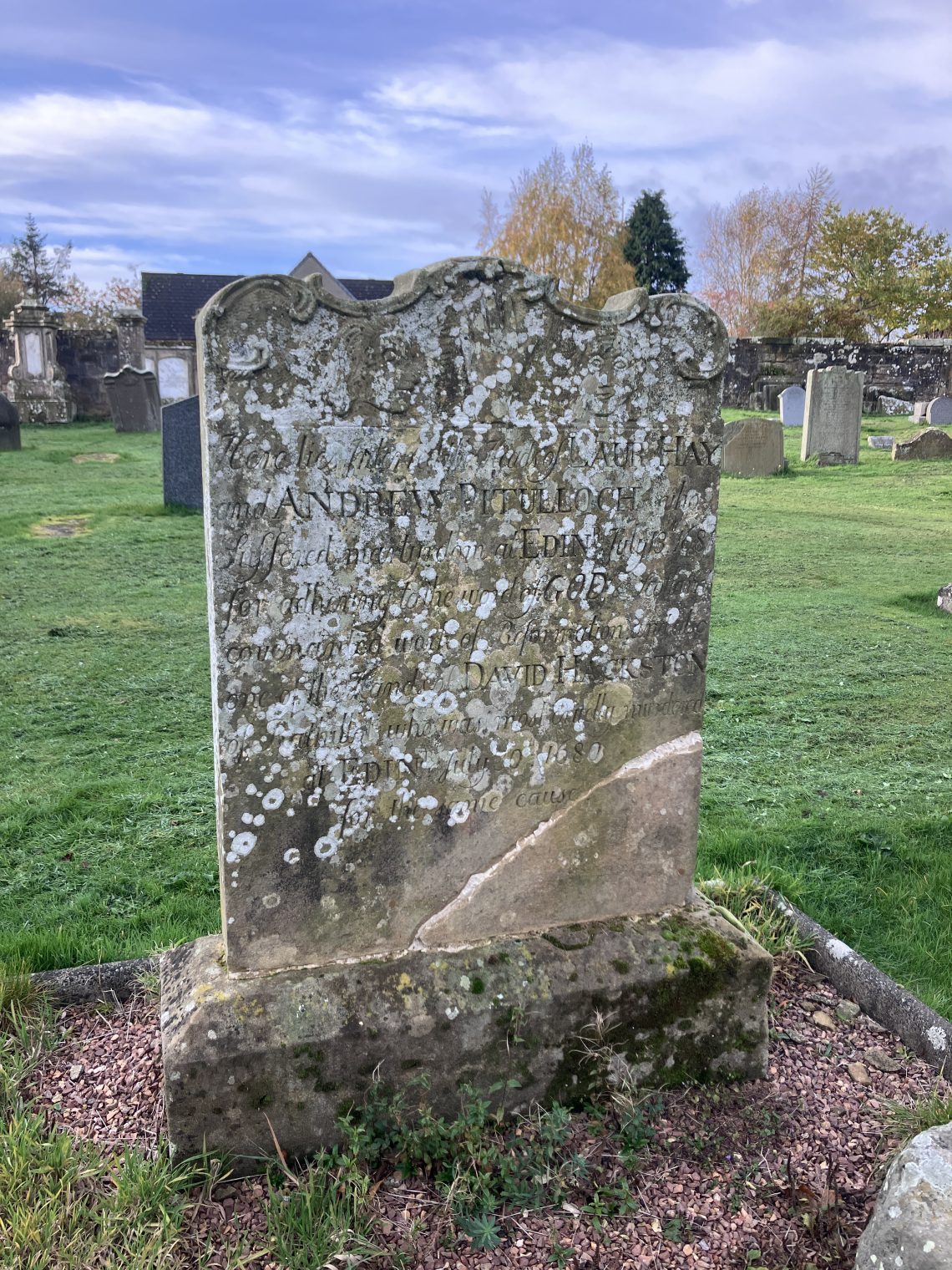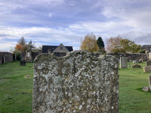 There is a reason for the lengthy title of this post. The other day J and I went to the graveyard of Cupar Old Parish Church to try to find the “Covenanters’Grave”. It was raining and cold and windy, and neither the websites that mentioned it, nor the board in front of the church actually say where in the fairly substantial graveyard it is actually located. So the long and the short of it, is that we didn’t find it then. Today R and I went back on a better day and did find it – so here is an explanation.