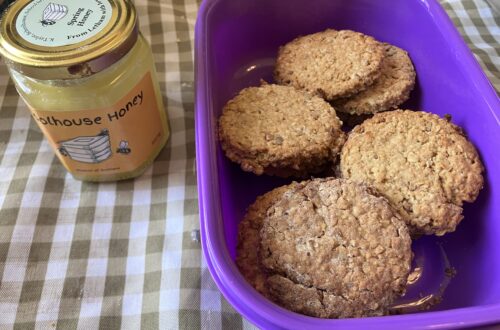 They are basically porridge oats soaked in milk with an added egg.  To this you can add what dried fruit, nuts, seeds and spices you fancy.  Then you bake the mixture on a tray and cut it into strips.  They were actually pretty good – they were not crisp (though I think that was because I added too much milk), more a chewy consistency but very tasty – and no added sugar or fat.