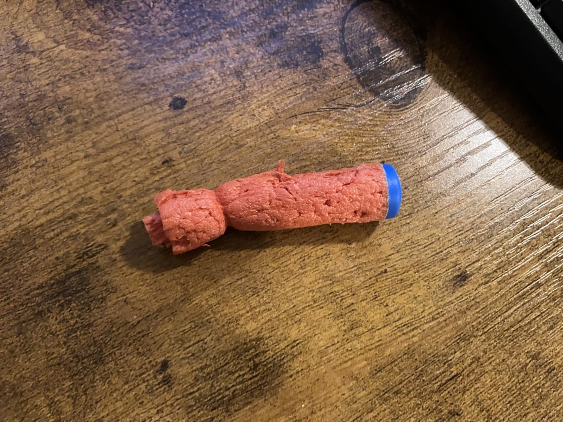 So we tied one to a string and it became the all time favourite toy. They have chased it around, carried it up and down stairs and given it a really good biting. Several weeks later, the bullet looks like this.