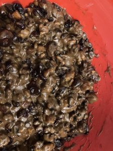 I am keeping making my main cake until the traditional day – but I am going to see my sister in law on Sunday and I always take her a cake. As she is a vegan – obviously the recipe needs a bit of modification and I have tried loads of variants on it in the past. None have turned out that well – they always seem dried up and some how a bit “healthy” looking which you don’t want in a cake. However this year’s seems a bit better – here is the mix (made with the ready soaked fruit).
