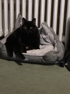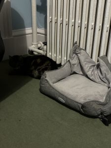 So first he put it on the radiator itself. She ignored it, and when he put her in it, she jumped straight out (rinse and repeat several times). So then he thought he would put it on the floor to get her used to it – this is what happened.