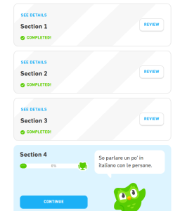Anyway – this coming year we are having a holiday which is now booked. We are going to Naples and the Sorrento peninsula for a week in January. The weather will not be fantastic, but we are going to absorb culture rather than lie on beaches, and to that end I have been learning Italian with Duolingo (plus a grammar book). I have a 228 day streak going, and today I finished Unit 3 – so just unit four to go.