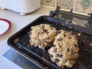 Enough grumbling – I made an old favourite from Deliaonline today – Apricot and nut crunch. I used raisins instead of apricots (R claims not to like apricots). I only bake these for holidays because everyone (me included) likes them A LOT and they are on the fattening side.