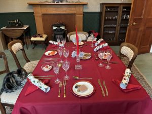 Our table laid for Christmas Dinner. Unfortunately my turkey was not very good – tough and dry. It was a crown from Donald Russell and I will not be buying frozen again. The local smoked salmon and my famous sherry trifle were great though – so no one went away hungry.