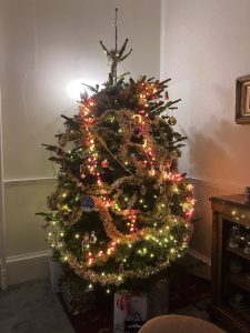 Our Christmas tree with all its lights on – it looked unbalanced the way I originally had it – so that is it with four full sets on!