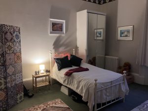 Our turret room done up as a guest room (all the gym kit concealed behind a screen)