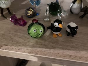 My cutest present – a glass sprout. I always put little presents I choose myself in self-fill crackers rather than having the crap you get in commercial ones. This year one of them was a super cute brussels sprout, but there was also a puffin and a sheep which no one took home. So I pinched them back – I have quite a collection of things I have acquired this way over the years.