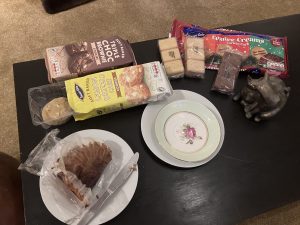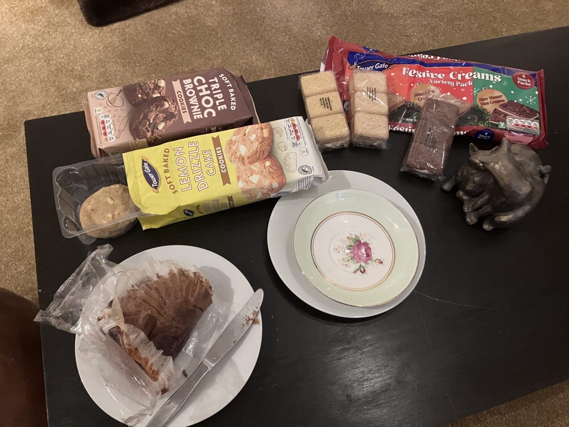 Note the bone china plates and the edible items: – a Norfolk plum cake, lemon drizzle biscuits, chocolate chip cookies, and something particularly disgusting which only J would have purchased.  A “festive custard cream selection” – custard creams flavoured with after eight mint, gingerbread and (this one is the worst) mince pie.
