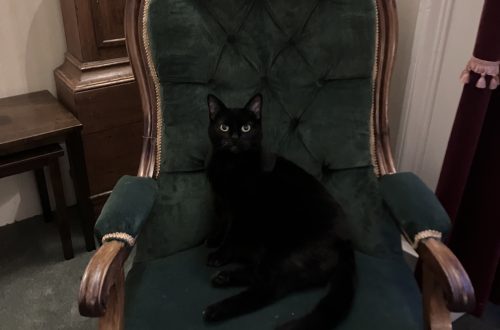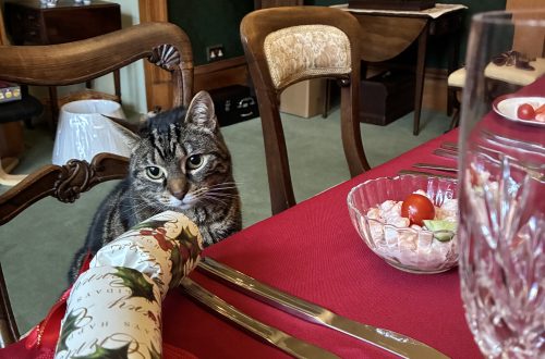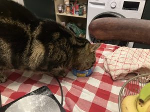While we were enjoying these delights in the basement, Saphy had discovered a snack of her own – I had left an open can of tuna on the kitchen table.