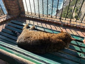 After lunch we went to the gardens of Augustus. At the top there is a terrace with a bench overlooking the cliffs and the bay of Naples. This bench must have the best view in Europe, if not the world, and you would think that there would be a queue of people waiting to sit on it and stare out over the wine dark sea. But all people were really interested in doing was queuing up to pet the enormous cat which had ownership of the bench. He was tolerating his fan club sitting next to him one by one – R even got to be one of them.