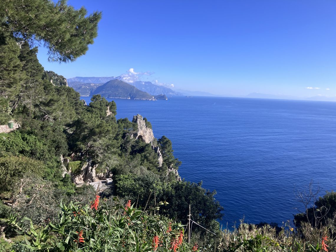 There were many, many steps. We had heard it was possible to go all the way down to the bottom to see a Roman matrimonial cave (whatever that is) but as that looked to be several hundred more steps, we decided against it and went back to the town where we had a super lunch at a restaurant with views to die for. This was the first semi-formal meal we have had in Italy – fresh buffalo mozzarella two ways with ham to start. Then I had seafood pasta and R had gnocchi capresi.