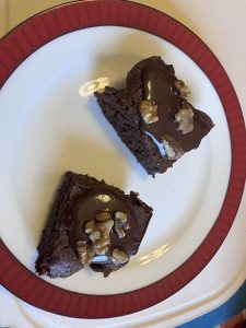 Anyway, I made some chocolate brownies for a lunch at church the other day and these really suited both of us as they were made with dark chocolate but also had sugar and butter in them for extra sweetness and squidge factor.  To make them look pretty, I put an icing glaze and a walnut half on each cake.  They were, even if I say so myself, seriously good.  There was enough food at the church lunch for about three times the number of people there, so quite a lot of the brownies came back, and the three of us have been having one each with a cup of tea in the evenings.
