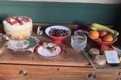 Normally we have our Sunday lunch in the formal dining room, but I am in the middle of decorating it, so I brought J’s downstairs for him. He was (as ever) engrossed in a computer game, so I left the main course and the dessert next to each other on his basement dining table for him.
