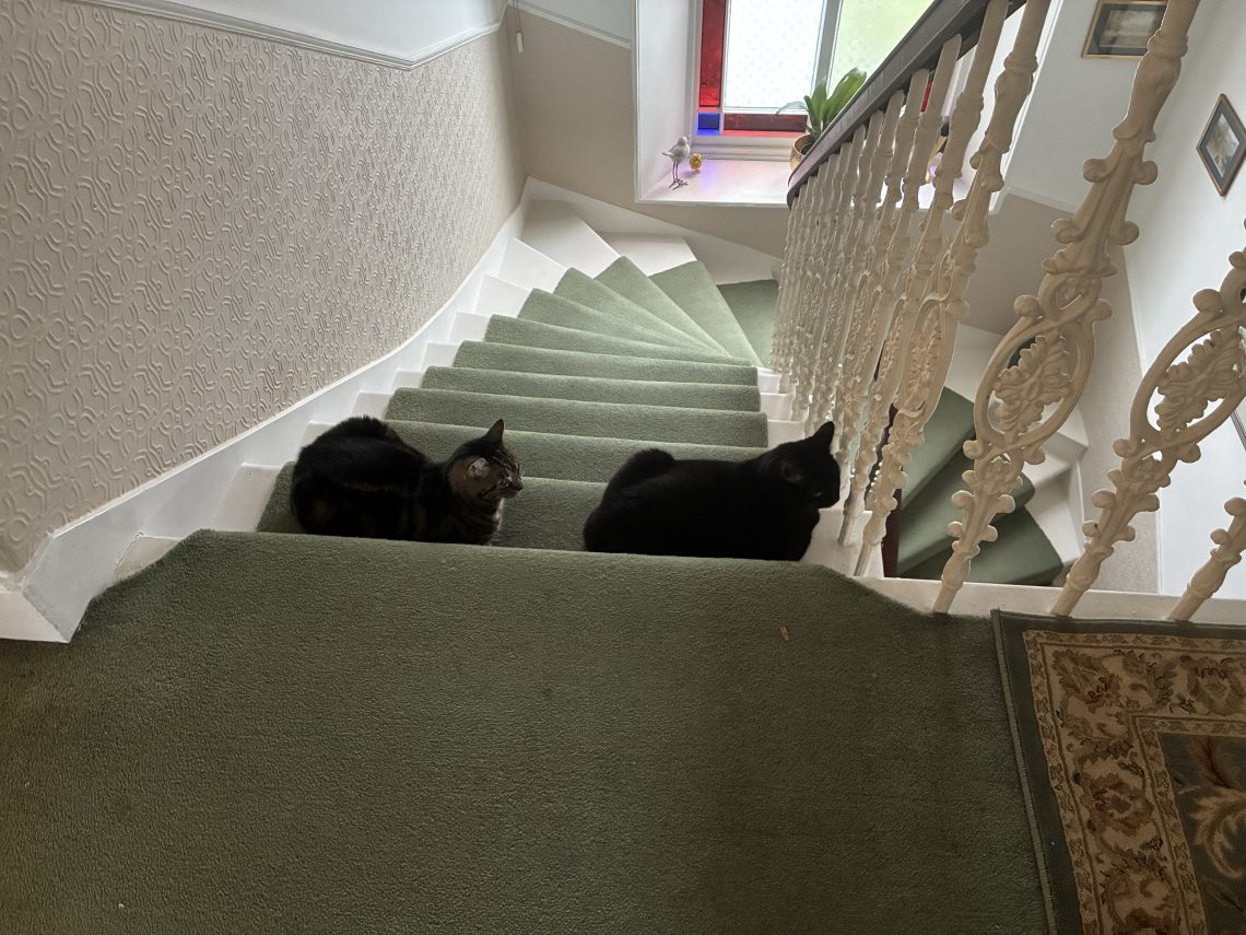 R encountered a feline road block on the way downstairs this morning.
