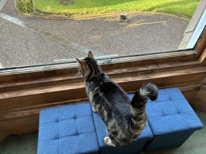 So now the cats have a place to view without the poor dears having to stand on their back paws to peer out. Amber is still a bit reluctant, but Saphy definitely likes it.