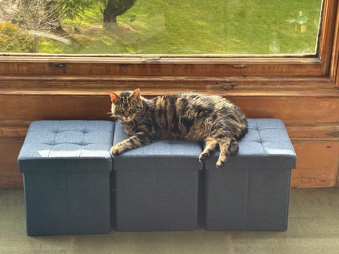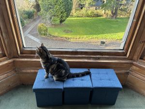 I can never think of ottomans without the quote from AA Milne “He gets what exercise he can, by falling of the ottoman”. Anyway, R bought an ottoman today, partially because he is perennially short of storage space, and partially to give the cats a place to look out of the window. R’s office has the best view in the house – a fabulous mix of garden and roofscape, plus no less than five spires.