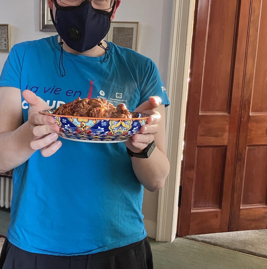 He is now self-isolating in his basement and R was required to to take his food down to him.  The disease has not impacted his appetite as he ate a large bowl of chili con carne.