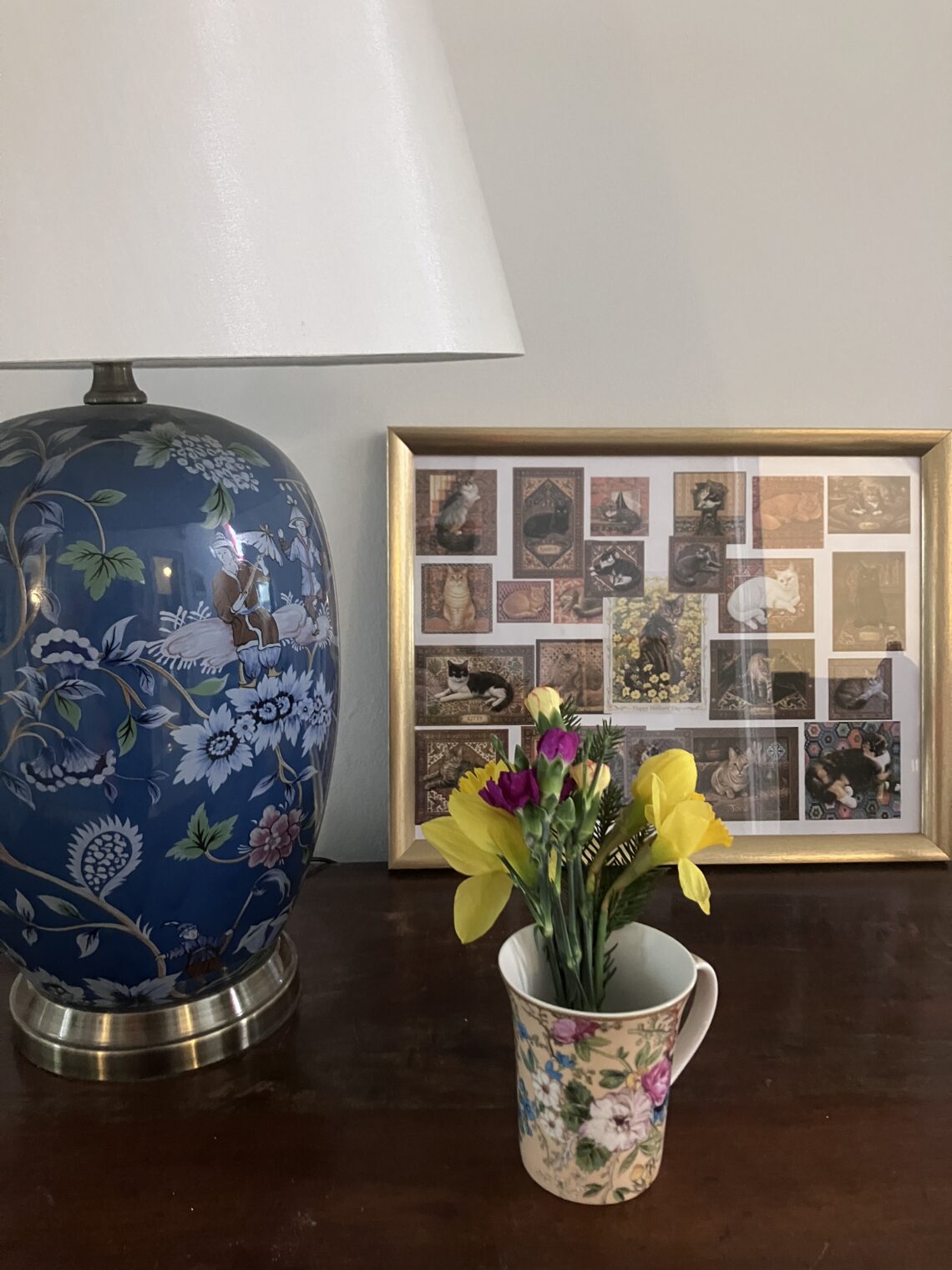 We were all three of us going over to see our Mum/Mum-in-law in Helensburgh today. I had to get up specially early to go to church at 8am rather than 10:30am because it is a long drive, but we were given a lovely posy which you can see in the photo (in a Victorian mug which is nothing to do with mothers but was bought by me from Amazon because I liked it – sorry). The lovely blue lamp was a house warming present from Mum.