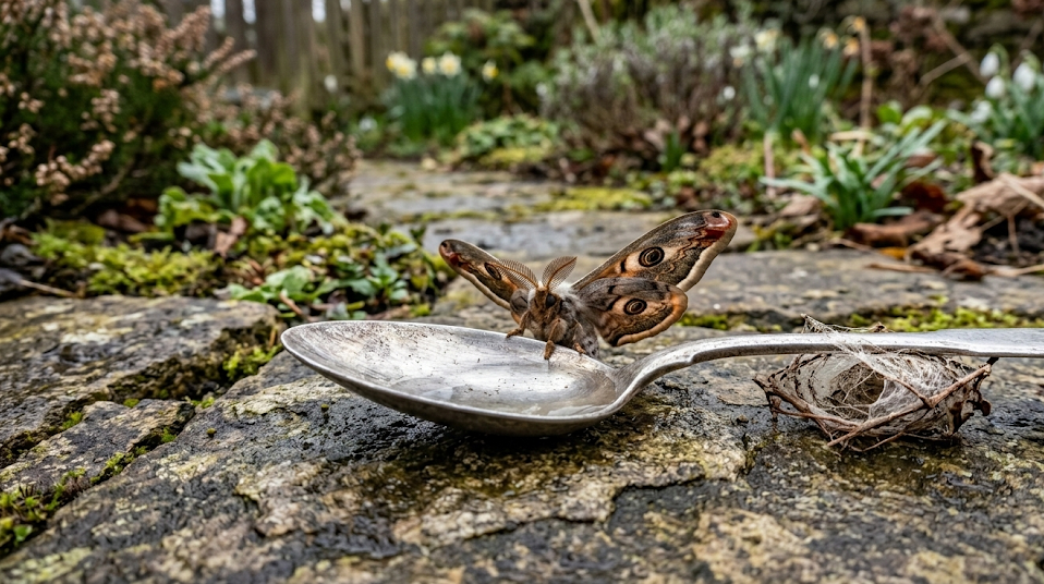 To give it the best chance I could, I went and got some sugar in a teaspoon and dissolved it in a little water. Then I very carefully manoeuvred the moth on to the spoon and put it down on the path. It seemed to feed a little from the sugar water, and I could see its wings getting more rigid. Suddenly it spread them and shot off into the sky – it was quite some flier because it must have been about 20 feet over head and making for the trees when we lost sight of it.