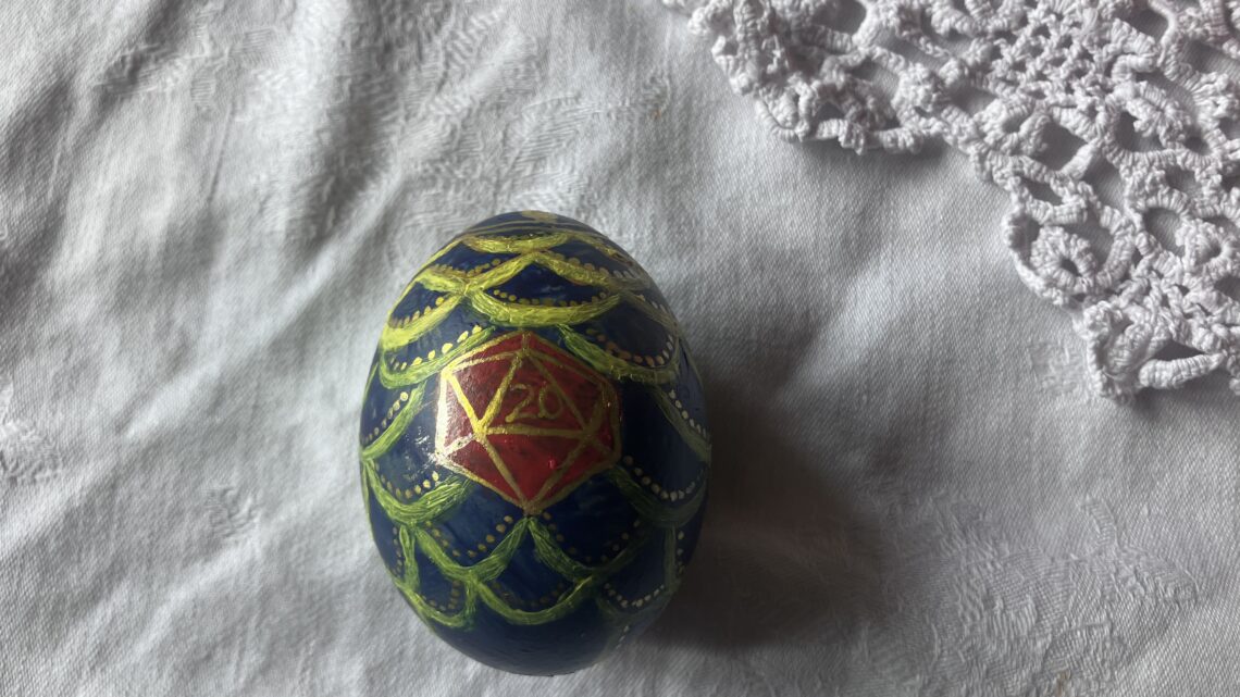 But the undisputed winner of the competition was J. Quite seriously, his egg was brilliant – he based it on a Faberge one, but added a d20 for DDO. J really is a very talented artist – I wish I could induce him to paint more often.