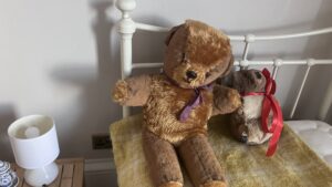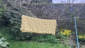 I don’t know how J ended up with it, but this was my blanket as a child – I used to play with it along with my toys, and one of my favourite occupations was tying knots in the long tassels of its fringe. I hung it on the line outside, and assessed whether it needed dry cleaned or whether I could get away with hand washing it. I was somewhat surprised to see that it showed no signs of dirt.