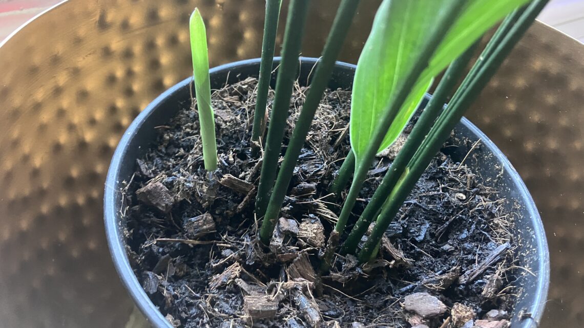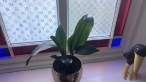 The smaller of our two aspidistras, Aspie has just put out two new shoots. For all they call them “cast iron plants”, she was not happy living in the basement, and had to be given pride of place in front of the stained glass window in the hall upstairs