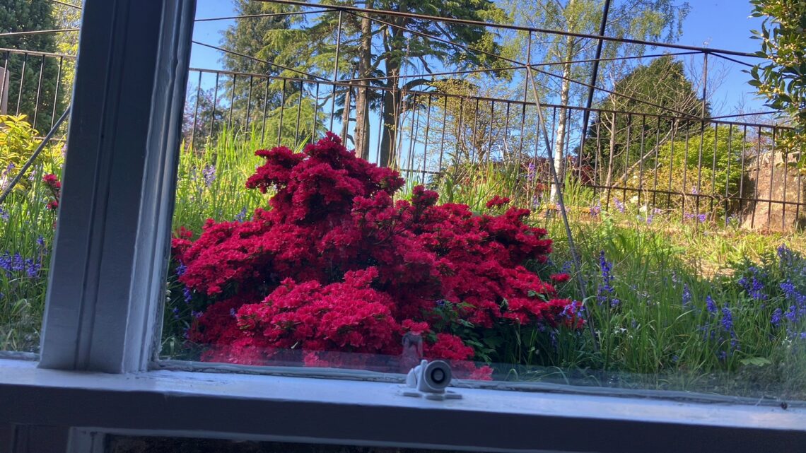 But one other peculiar thing that is still a bad feature of the house is that at the front there are railings and below them a garden area on each side. This gives a pleasant view from the basement, but believe it or not, the only way to weed these small gardens is either to climb over the railings from the outside and climb down a very steep slope followed by a six foot drop, or to climb through the basement window. You have to do this not once but twice, because the areas are not connected to each other. This is frankly lunacy. Well I think I mentioned the other day that I have to sit in the back seat of the car because the two men “will not fit”? Well remarkably, the same applies to the basement window – there is no way their vast six foot bulks can be squashed through that tiny gap, whilst my sylph-like figure slips through with no problem. So today I climbed through the windows and weeded the front areas. To get to parts of them I had to climb up the six foot wall I mentioned and then balance on a narrow ledge holding on to the railings. Fun and games but all the weeds are gone now and it all looks quite nice – including the very spectacular azalea you can see in the picture.